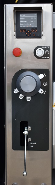 De gebruiksvriendelijke bedieningselementen zijn handig naast de primaire haspel geplaatst, met een draaiknop om het debiet aan te passen en een digitaal display voor de volgende functies en sensormetingen: